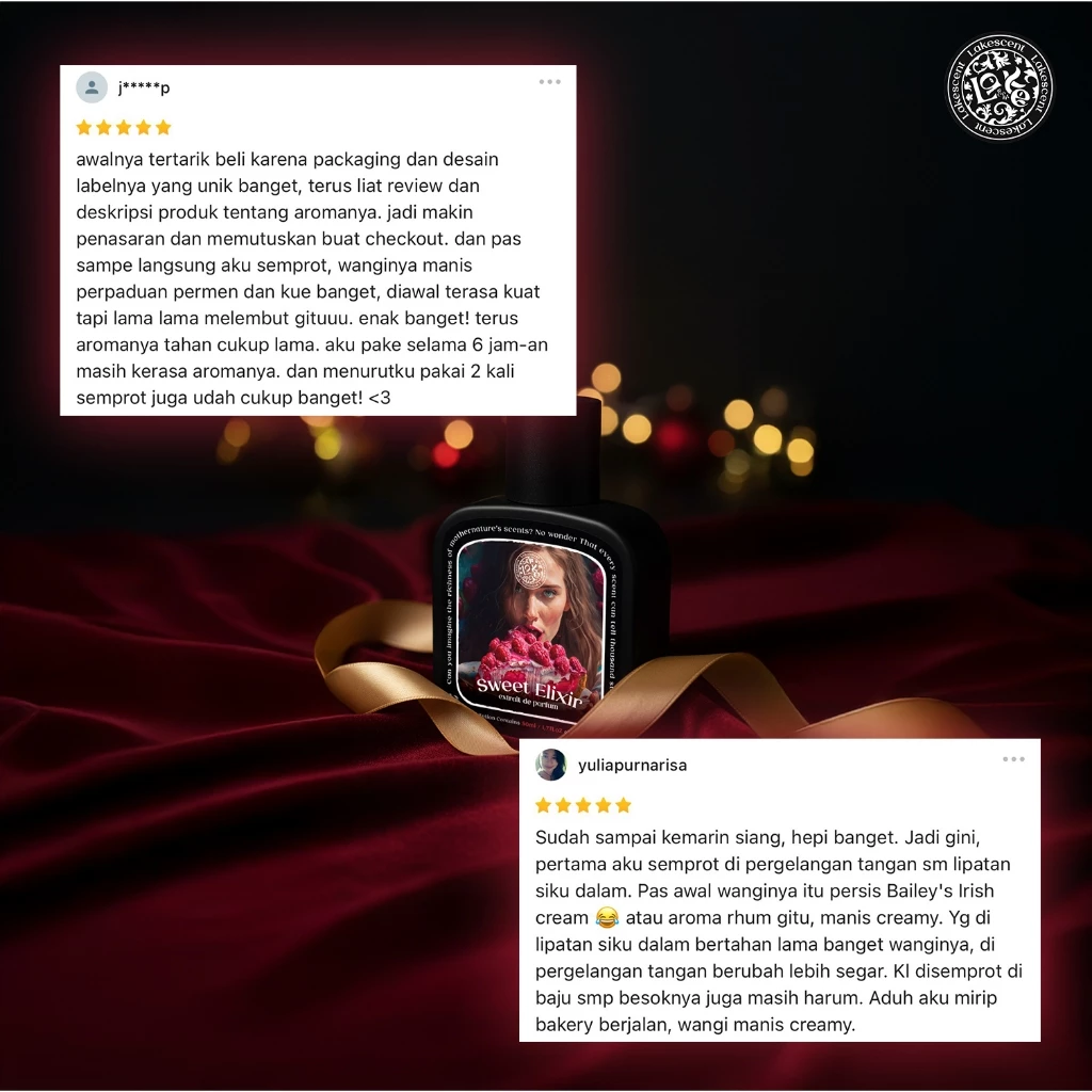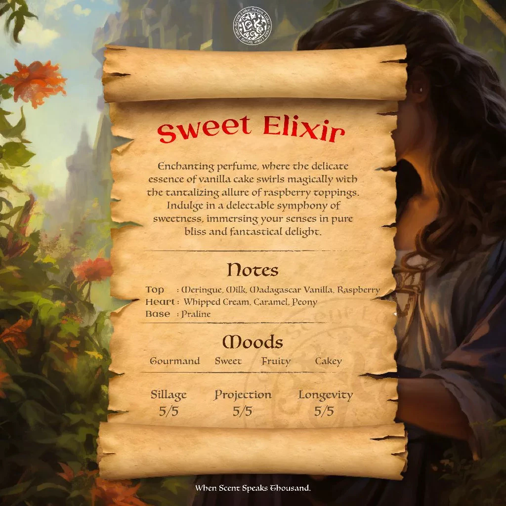 Aroma Sweet Elixir menghadirkan sensasi me time di balkon rumah, ditemani dengan vas bunga kecil dan aroma vanilla cake bertopping whipped cream serta buah raspberry. Meringue dan susu memberikan kesan manis seperti kue, yang dipadukan dengan vanilla dari Madagascar dan raspberry untuk aroma fruity yang segar. Sentuhan dari whipped cream, caramel, dan peony menambahkan kelembutan dan kehangatan seperti melebur dalam suasana taman penuh kupu-kupu dan kelopak bunga yang beterbangan, menciptakan aroma yang manis, lembut, dan berkesan dreamy.